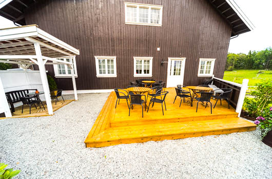 Fra lokalet er det direkte utgang til romslig og skjermet terrasse med utemøbler og paviljong.